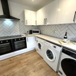 The house features six fully furnished double bedrooms, two modern communal bathrooms with showers, a stylish living room with sofa, dining space and wall-mounted TV, and a large kitchen with double ovens, ample storage, washing machine, tumble dryer and dishwasher. High-speed broadband is also included.