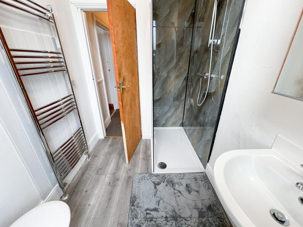 First Floor: Two further double bedrooms, another shower room, a dining area with table and chairs, and a fitted kitchen with white goods. The kitchen leads out to a larger rear garden, ideal for barbecues and relaxing with housemates.