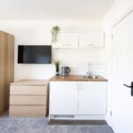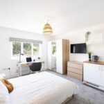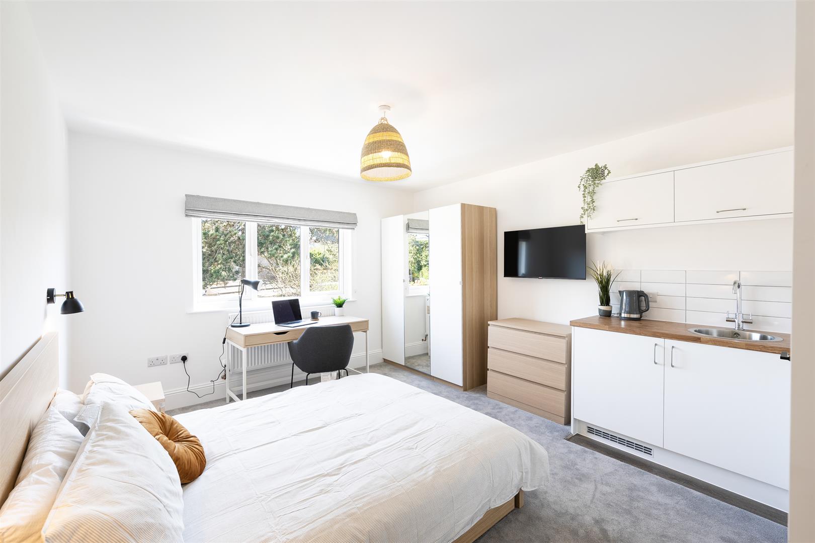The room is fully furnished with a comfortable double bed, desk for home working, drawers and cupboard storage. It also benefits from its own ensuite bathroom and a built-in tea station with under-counter fridge, plus a TV for added convenience.