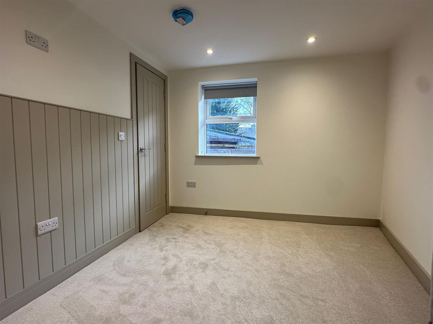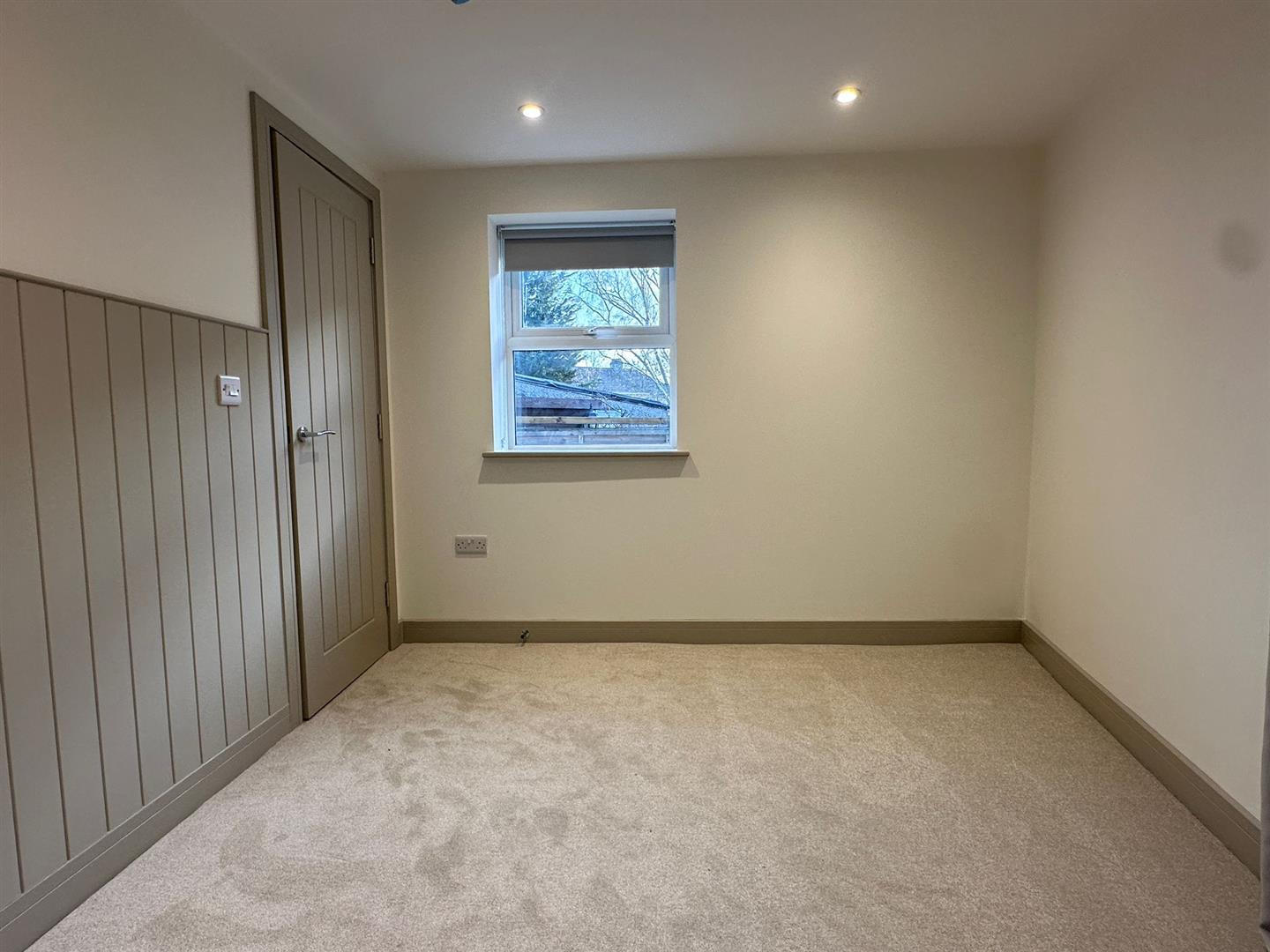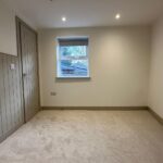 The bedroom is generously sized and benefits from wall panelling, adding character to the space. New carpets and flooring have been fitted throughout, and the flat is ready for its first occupant following refurbishment. A double door to the rear opens onto a small gravel area.